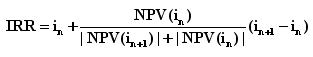 其次,找出与上述两个相邻净现值相对应的两个贴现率,代入下面的线性公式中即可求出内部收益率。即通过反复试算求出使NPVn略大于零时的in,再求出使NPVn+1略小于零时的in+1,在in与in+1之间用直线插值法求得内部收益率IRR。