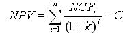 式中,NPV-净现值;NCFi-第i年的净现金流量;k-贴现率(资本成本或企业要求的报酬率);n-项目预计使用年限;C-初始投资额。