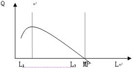 (2)L1后边际产量递减,继续增加劳动投入到L3,MP=0. 如果再增加劳动投入,边际产量为负值。(劳动相对过剩,资本不足,劳动的边际产量下降。达到L3,增加单位劳动带来的边际产品为0,劳动量继续增加就必然出现人浮于事的状态,劳动边际产品为负值,即增加劳动不仅不能增加产出,反而会导致总产量下降。)