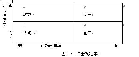 波士顿矩阵根据市场增长率和市场份额两项指标,将企业分为“明星”、“金牛”、“瘦狗”和“幼童”。