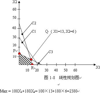 将化简的不等式方程作为画在直角坐标系中,见图1-8。从图1-8中,找到最优解为Q点,即C2直线与C3直线的交点。解方程组得出Q点的坐标为(13,6)。将Q点的坐标值代入目标函数,得