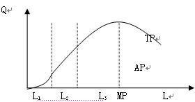 (2)在劳动投入在L1 ,L3之间时,劳动的边际产量递减,但为正数,所以总产量是以递减的速度增加,总产量曲线向上倾斜,并且斜率递减,即凹向L轴。