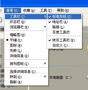 (3)工具栏。若当前的资源管理器窗口没有显示所需要的工具栏命令按钮,看单击“查看”“工具栏”“标准按钮”命令。