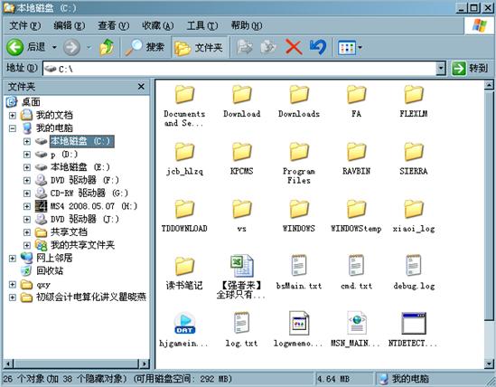 在左窗格中单击某驱动器或文件夹时,该对象呈反蓝显示,同时在右窗格中显示该对象的所有子文件夹和文件。(如图所示)