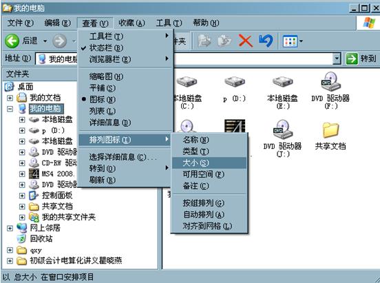 (5)图表排列:Windows可以按四种不同的方式排列右边窗口的文件:名称、类型、大小和日期。