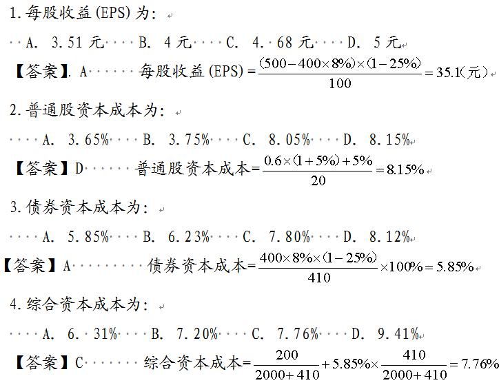 2.该公司目前息税前利润(EBIT)为500万元,适用的所得税税率为25%,采用市场价值作为计算各种资本比例的价值基础。