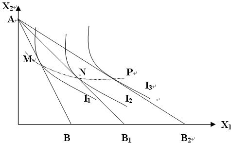 (1)MNP连接起来得到一条价格-消费曲线,表示消费者偏好和收入不变时,与一种商品价格变化相联系的两种商品在不同价格下的效用最大化组合。