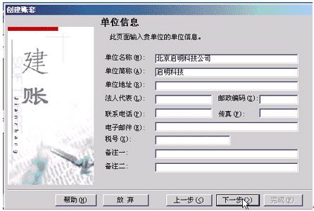 单位信息用于记录本单位的基本信息。主要包括单位名称、单位地址、法人代表、邮政编码、电话、传真、电子邮件和税号等信息。如:单位名称:北京启明科技公司;单位简称:启明科技。