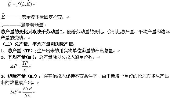一般假定基本投资一定,即厂房、机器设备等在某一时期内不能变化,只能改变使用的劳动力数量,来调整企业的产量时,企业的选择及其合理性。一种可变要素的生产函数也称短期生产函数,基本形式为: