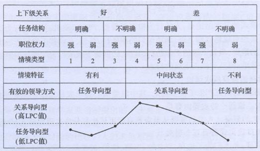 费德勒将三个情境因素组合为八种情况,提出了在不同情况,应当选择的领导方式。