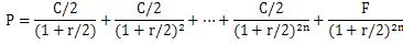 如果变为每半年付息一次,那么上面公式中相应的每期利息C/2,利率r/2,付息期限增加一倍。
