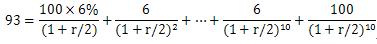 【例题2,计算题】某公司以12%的利率发行5年期的附息债券,每半年支付一次利息,发行价格为93元,票面面值为100元,则求到期收益率?