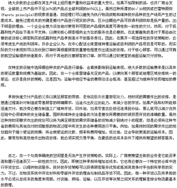 一个厂商的存货需求取决于网络结构和顾客服务期望的水平。从理论上讲,厂商会在设施中储备每一种销售产品。以致力于为每一位顾客服务。但是,因为这种储会增加总成本,而且对厂商来说,也有一定的风险,因而很少有哪种经营作业能承担得起如此耗资的存货义务。存货的目的是要以始终与最低的总成本相一致的最低限度的存货义务来实现所期望的顾客服务。虽然过度的存货可以用来弥补物流网络的基本设计中的不足,但在某种程度上却降低了物流管理的质量,而且,把过度的存货用作向顾客提供的服务,将最终导致更高的物流总成本。