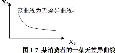 无差异曲线是一条表示能够给消费者带来相同满足程度的两种商品的所有组合的曲线,在这条曲线上的所有各点的两种商品组合带给消费者的满足程度是完全相同的,消费者对这条曲线上各个点的偏好程度是无差异的。如图1-7
