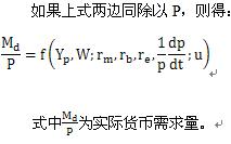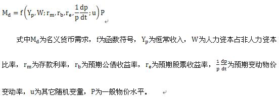 弗里德曼是沿着剑桥方程式来表达他的货币需求思想的。同时,吸收了凯恩斯主义关于收入和利率决定货币需求量的思想。他认为,在剑桥方程式Md=KPY中,P,Y是影响货币需求许多变量中的两个变量, 代表其它变量,实际上是货币流通速度的倒数(1/v)