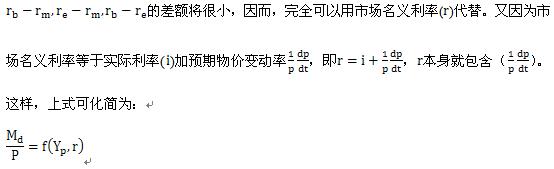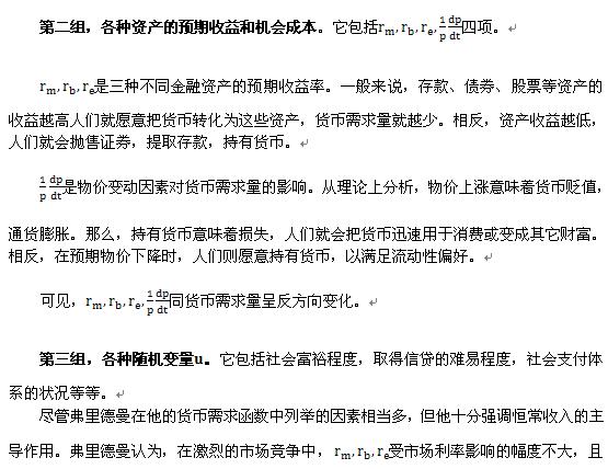 (3)凯恩斯认为货币需求量受未来利率不确定性的影响,因而不稳定,货币政策应“相机行事”。而弗里德曼认为,货币需求量是稳定的,可以预测的,因而“单一规则”可行。