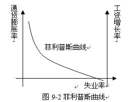澳大利亚著名经济学家菲利普斯通过研究1861--1957近100年英国的失业率与物价变动的关系,得出了结论:失业率与物价上涨之间,存在着一种此消彼长的关系。这一关系可用图9-2来表示。