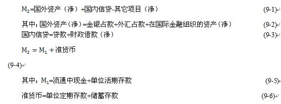 从(9-4)式可知,从广义货币M2的构成方面分析:一是M1的变动,二是准货币的变动。如果是M1的变动影响大,可进一步分析流通中现金及单位活期存款及影响其变动的因素;如果是准货币的变动影响大,可进一步分析单位定期存款和储蓄存款及影响其变动的因素。