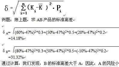 标准差反映的是概率分布中各种可能结果对期望值的偏离程度。标准离差越小,说明离散程度小,风险也就越小。