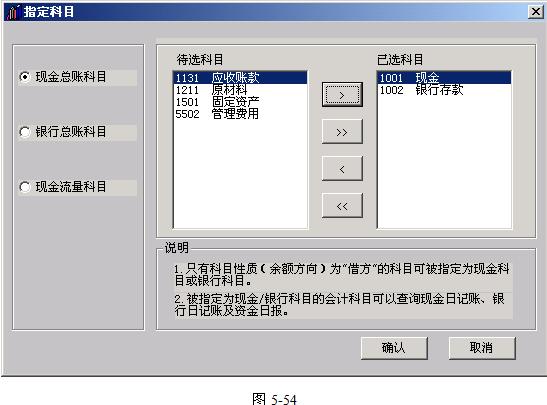 指定会计科目是指定出纳专管的科目。指定科目后,才能执行出纳签字,从而实现现金、银行账管理的保密性,也才能查看现金或银行存款日记账。