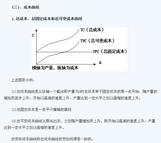 (8)边际成本曲线最早达到最低点,其次是平均可变成本曲线,总成本曲线的最低点出现的最慢,且高于边际成本曲线及平均可变成本曲线的最低点。