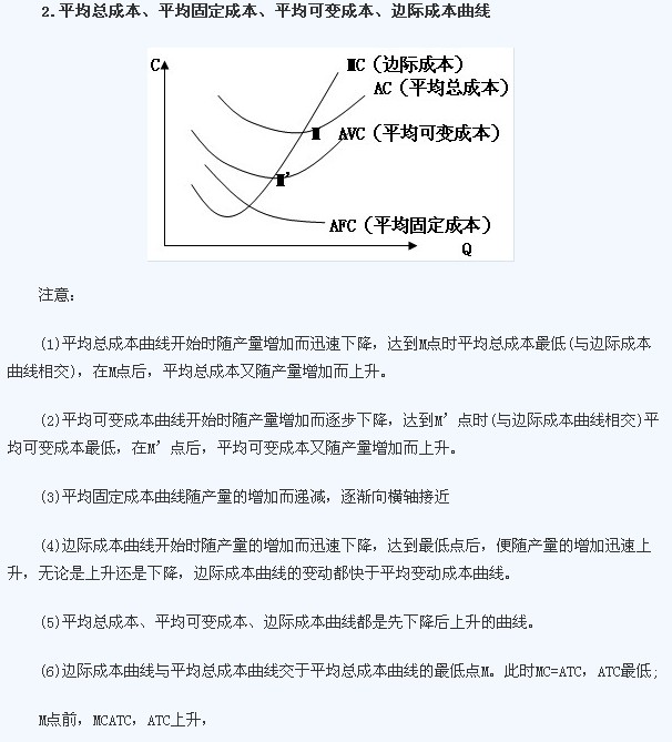 (7)边际成本曲线与平均可变成本曲线交于平均可变成本曲线的最低点M’,此时MC=AVC。M’之前,AVC下降,MCAVC.