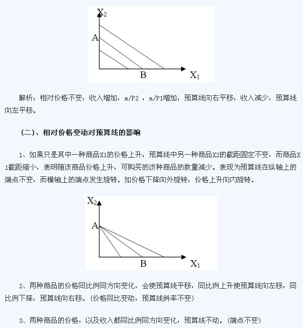 在相对价格不变的情况下,收入改变,会使预算线出现平行移动。收入增加使预算线向右平移,收入减少使预算线向左平移。