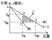 完全垄断下,如果根据MC=MR确定运量为QM则社会福利水平为abePMC,这时可以给铁路企业带来最大利润却不能使社会福利最大化。应采用P=MC=PMC,则这时运量为QMC,产生的总社会福利为adPMC,这时社会福利最大。
