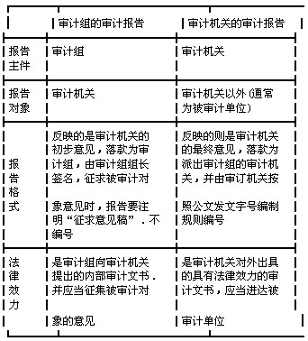 我国国家审计的审计报告是审计机关实施审计后,对被审计单位的财政收支、财务收支的真实、合法、效益发表审计意见的书面文件。包括审计组的审计报告和审计机关的审计报告两种。二者的区别如下