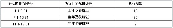 报告期末执行周数对应表中上年冬春航班的计划期时间,周数为13周;计划期夏秋航班执行周数为30周;冬春航班计划执行周数为9周。