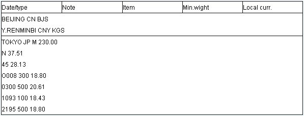 第五栏,LOCAL CURR――用运输始发地货币表示的运价或最低运费。