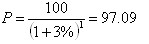 例:假若面额为100元的债券,不支付利息,贴现出售,期限1年,收益率3%,到期一次归还,则该债券的价格为: