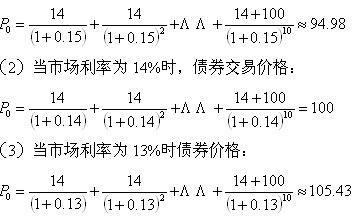 例:现有年收益率为14%每年付息一次的债券,面额100元,期限10年。当市场利率为15%时则交易价格: