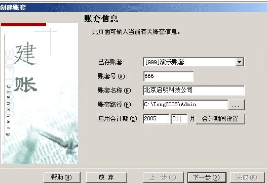 3.账套路径:用来输入新建账套将要被放置的路径。如“C:\Tong2005\Admin”
