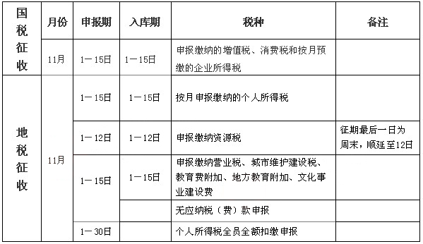 摘要 为方便办税人员了解各税种的申报日期,环球网校现特为大家整理了“11月份纳税申报办税日历”,以供大家参考。