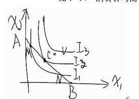 在切点C,无差异曲线I2的斜率恰好等于预算线的斜率。商品边际替代率=商品的价格之比