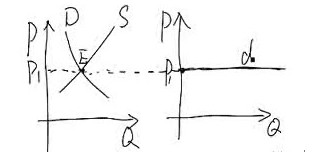 整个行业的需求曲线是一条向右下方倾斜的曲线,供给曲线是一条向右上方倾斜的曲线。由整个行业的供求决定其均衡价格,如图所示。
