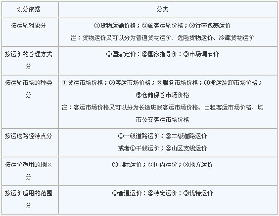 (1)按运输对象划分的运价:根据不同货物实行差别运价,主要有普通货物运价和特种货物运价。