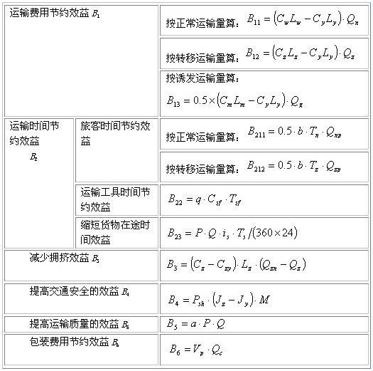 ■效益:表现为所设计的运输系统在客货运输过程中发生的各种运输费用的节约、运输时间的节约、拥挤程度的缓解、运输质量的提高、包装费用的节约、设施设备维修养护费用的减少等等。