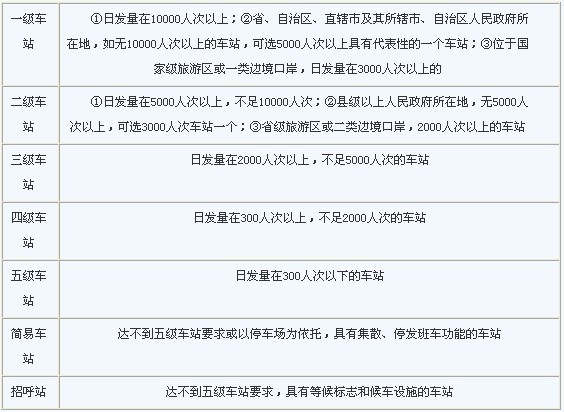 根据汽车客运站设施和设备配置情况、地理位置和设计年度平均日旅客发送量(日发量)等因素,将车站等级划分为五个级别以及简易车站和招呼站。