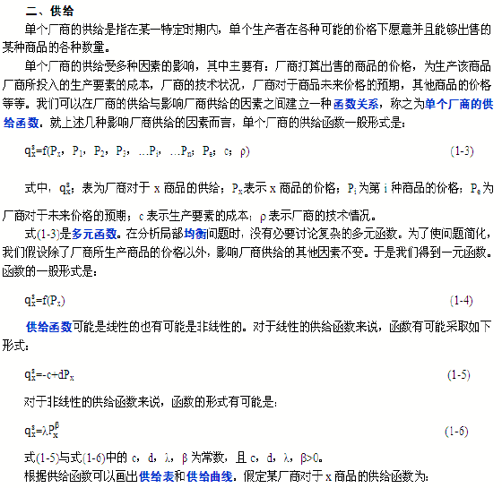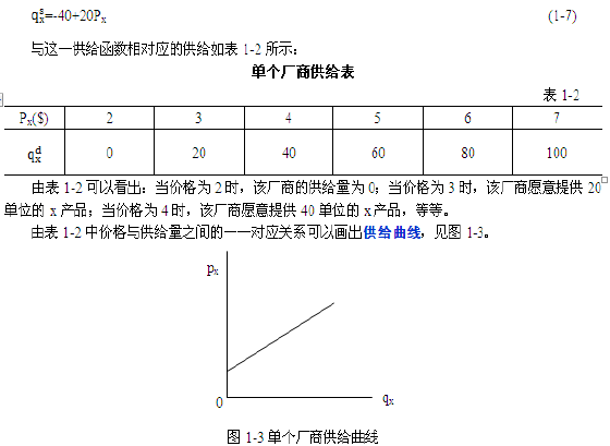 图1-3的供给曲线向右上方倾斜。不管是线性的供给函数还是非线性的供给函数,除了某些特殊的资源,比如土地、劳动等资源外,大多数商品的供给曲线是向右上方倾斜的,表明供给量与价格是同方向变化的。土地的供给就长期而言也是固定的,因此,土地的供给曲线与表示数量的横坐标是垂直的。在工资率提高到一定程度以后,闲暇对于劳动供给者来说可能价值更大,继续提高工资可能不仅不会使劳动者增加劳动供给,反而会使他减少劳动供给。因此,在某些条件下,劳动的供给曲线不一定向右上方倾斜。由于某些特殊资源的供给量与价格不一定呈同方向变化,因此并不存在供给法则。