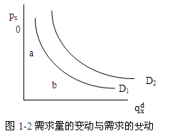 需求函数、需求表或需求曲线所刻画的是商品的需求量与商品的价格之间的关系,表明在各种不同价格下的需求量。一旦商品的价格发生变化,商品的需求量将随之发生变化。这种因商品自身的价格变化而引起的商品需求的变化称为需求量的变动。在局部均衡的条件下,需求理论中的另一种变动,即需求的变动也是值得探讨的。需求的变动是由于除了商品自身的价格以外其他因素的变化引起的。例如,消费者收入的变动、消费者偏好的变动、其他商品价格的变动等因素都会引起需求的变动。要区分需求的变动与需求量的变动。需求量的变动由于是商品自身价格的变化所引起的,因此并不改变需求函数,而需求的变动由于是除了商品自身价格以外的其他因素的变化所引起的,因此它的变动是整个需求函数的变动。从需求曲线来看,需求量的变动是同一条需求曲线上不同点的变动;需求的变动则是整条需求曲线的移动。在图1-2中,从a点到b点的移动是需求量的变动;而从曲线D1到D2的变动则是需求的变动。