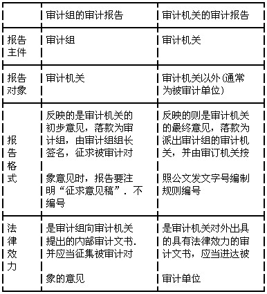 我国国家审计的审计报告是审计机关实施审计后,对被审计单位的财政收支、财务收支的真实、合法、效益发表审计意见的书面文件。包括审计组的审计报告和审计机关的审计报告两种。二者的区别如下