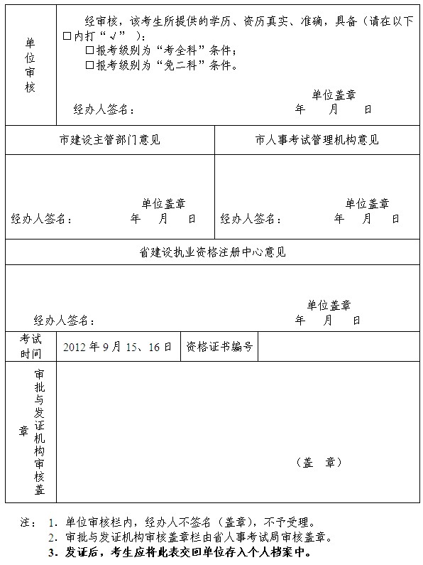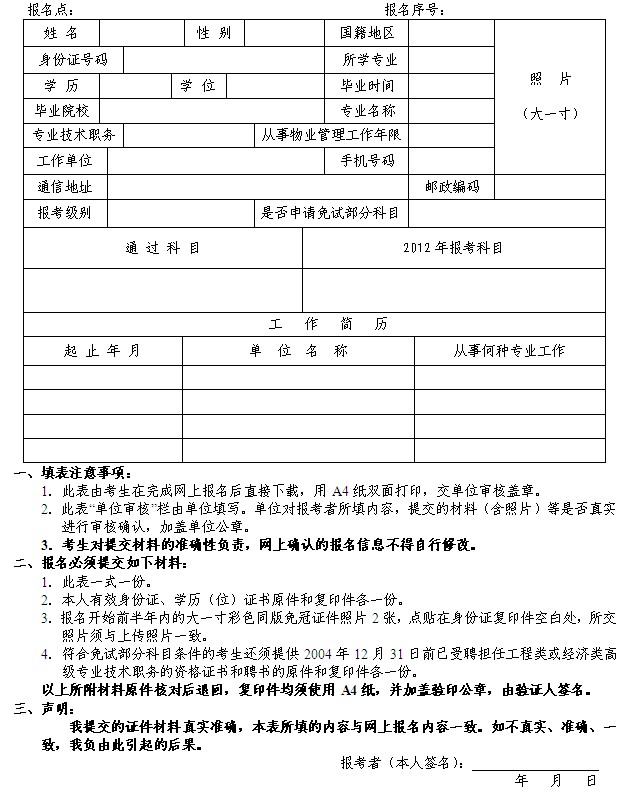 (一)《2012年度物业管理师资格考试报名发证登记表》(考生从网上自行下载,用A4纸双面打印,经单位审核盖章)一份。