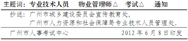 根据广东省建设执业资格注册中心、广东省人事考试局《关于2012年度物业管理师资格考试考务工作的通知》(粤建注发〔2012〕12号)要求,为做好我市2012年度物业管理师资格考试报名工作,现将有关考务工作事项通知如下: