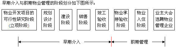 早期介入是指新建物业竣工之前,建设单位根据项目开发建设的需要所引入的物业管理的咨询活动。物业管理的咨询活动,主要指从物业管理的角度对开发建设项目提出的合理化意见和建议,其可以由物业管理企业提供,也可以由物业管理专业人员提供。前期物业管理是指从物业承接查验开始至业主大会选聘物业管理企业为止的物业管理阶段。