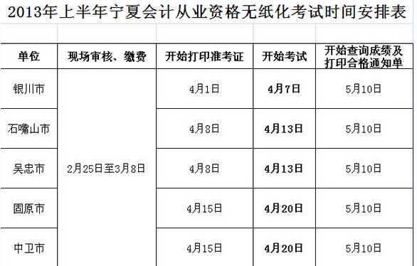 (三)现场审核、缴费(节假日正常休息)、打印准考证及考试时间:详见附件《2013年上半年宁夏会计从业资格无纸化考试时间安排表》。