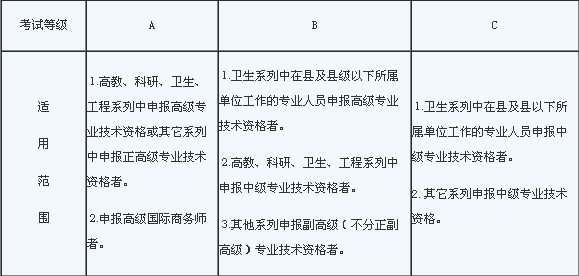 根据《关于调整完善我省职称外语政策的通知》(粤人发〔2007〕120号),考试等级划分及适用范围如下: