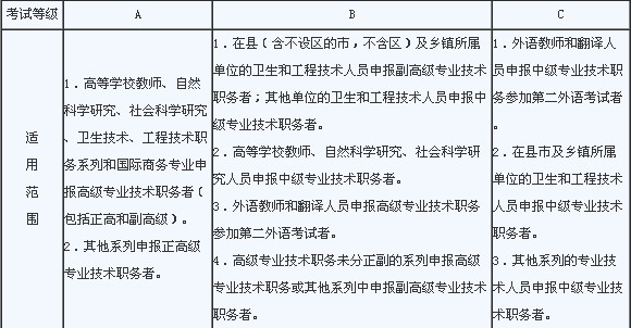 全国专业技术人员职称外语等级统一考试设“英语、日语、俄语、德语、法语、西班牙语”6个语种,每个语种分为A、B、C三个级别,其中英语每个级别分设综合、理工、卫生3个专业类别,其他语种不分设专业。按照原人事部《关于专业技术人员职称外语等级统一考试的通知》(人发〔1998〕54号)规定,凡从事理工、卫生类专业技术工作,职称外语考试选择英语的,应分别报考理工、卫生类相应级别。为不影响广大专业技术人员参加专业技术职务资格评审,凡参加职称外语考试的人员,应依据原山东省人事厅《关于专业技术人员职称外语等级考试有关问题的通知》(鲁人发〔2001〕97号),严格按照等级适用范围,在任现职期间参加相应级别的考试,不得越级报考。报考人员须根据自己所从事的专业工作,按照等级划分和规定的适用范围(见下表),选择相应语种、级别和类别应试,如有疑问应向单位人事部门咨询。