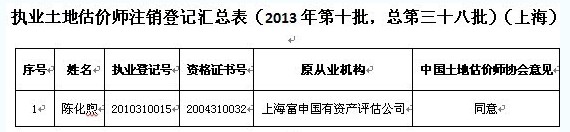 转发中估协关于土地估价师注销登记情况的公告(2013年第十批,总第三十八批)(上海)